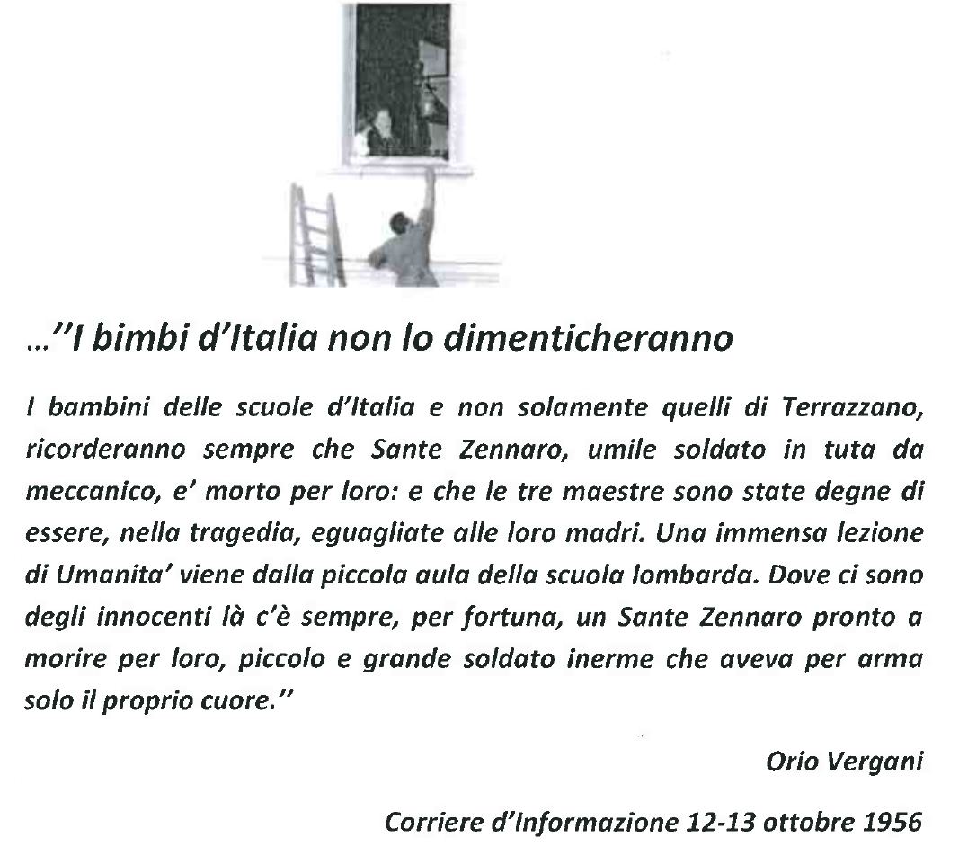 Come ogni anno, la domenica precedente l’anniversario del drammatico episodio, l’Amministrazione Comunale ricorda solennemente l’eroico gesto del giovane che, sacrificando la propria vita, ha salvato un centinaio di scolari e tre maestre, presi in ostaggio da due folli nella scuola elementare di Terrazzano, ora a lui intitolata. Partecipando alla manifestazione, gli alunni, le insegnanti, tutto l’Istituto vogliono ricordare con gratitudine Sante Zennaro, la cui memoria è tenuta viva dalla sig.ra Renata De Angeli, una dei cento bambini salvati, che ogni anno visita le classi, racconta con commozione la vicenda di cui si è trovata protagonista e rinnova i valori di solidarietà e impegno civile che devono continuare a ispirare le nostre vite.