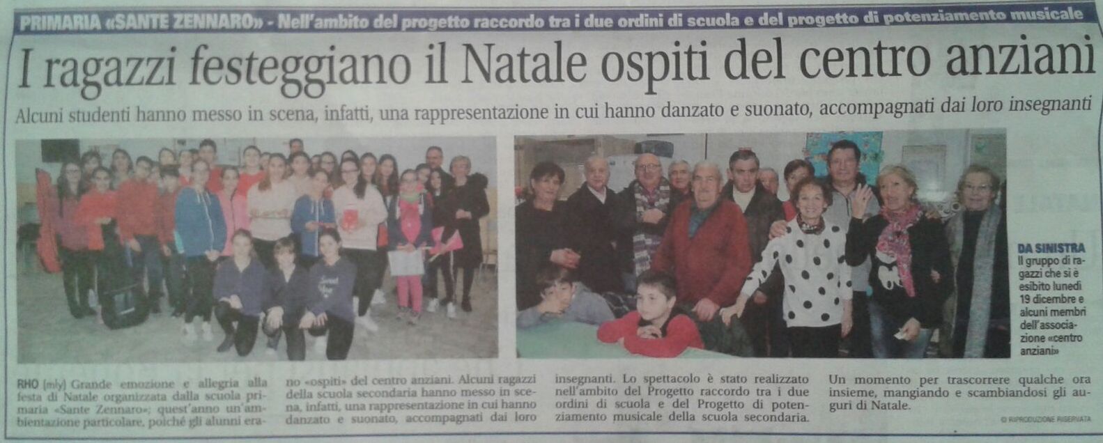 Tra le tante feste natalizie celebrate in questi giorni nei vari plessi del nostro istituto scolastico, ce n’è stata una molto particolare e degna di nota: alcuni alunni della scuola secondaria, accompagnati da tutti gli alunni della scuola primaria Sante Zennaro, hanno condiviso con gli ospiti dell’Associazione Centro Anziani, un emozionante momento musicale. Gli alunni, accompagnati dai loro insegnanti, si sono esibiti suonando dei brani musicali natalizi, creando una magia di emozioni. Il progetto è stato realizzato nell’ambito del raccordo tra i due ordini di scuola e il potenziamento musicale della scuola secondaria.