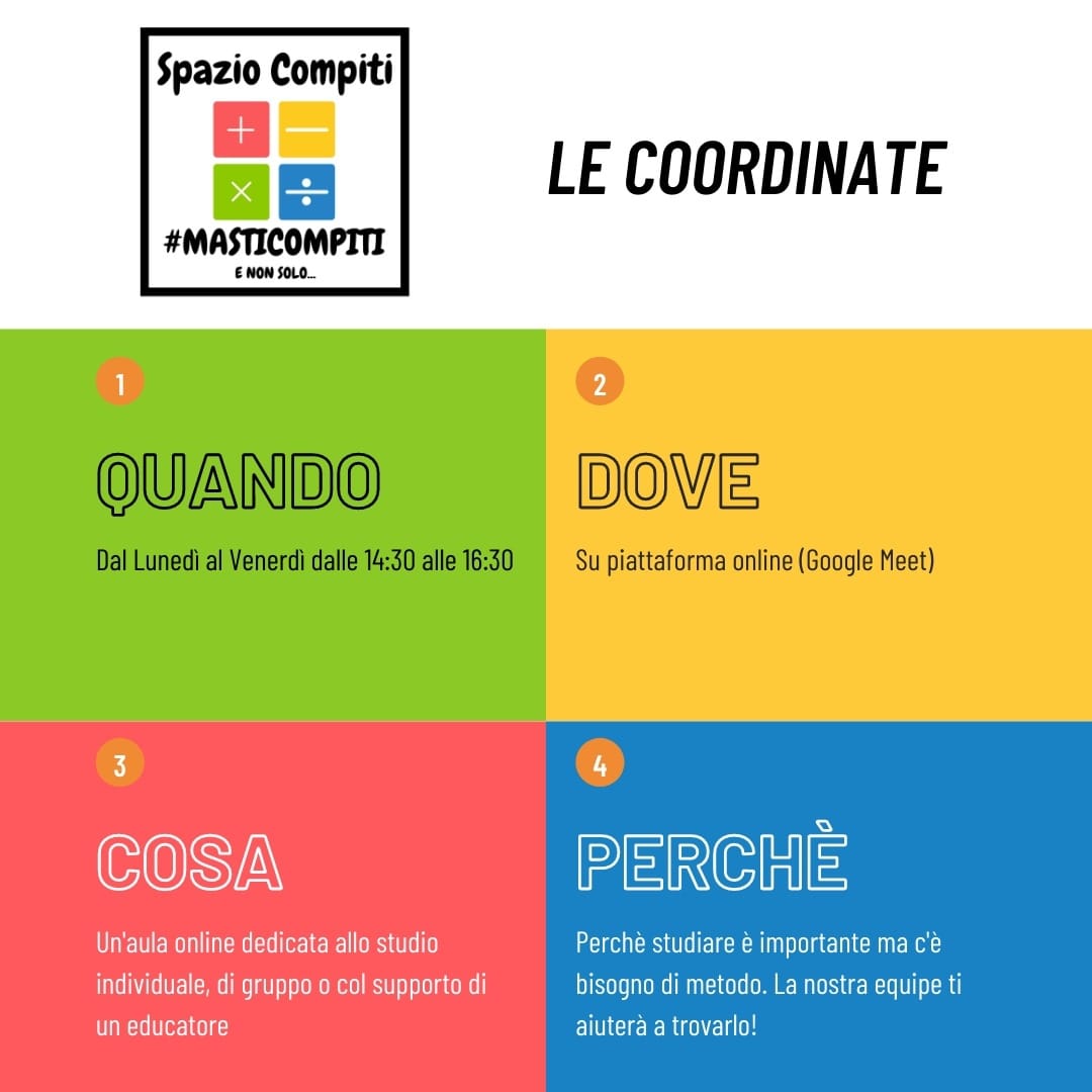 Lo spazio compiti sarà attivo dal lunedì al venerdì dalle 14.30 alle 16.30 previa prenotazione al link: https://www.progettomast.org/prenotazione-attivita/. A seguito della prenotazione sarà inviato il link di Google Meet