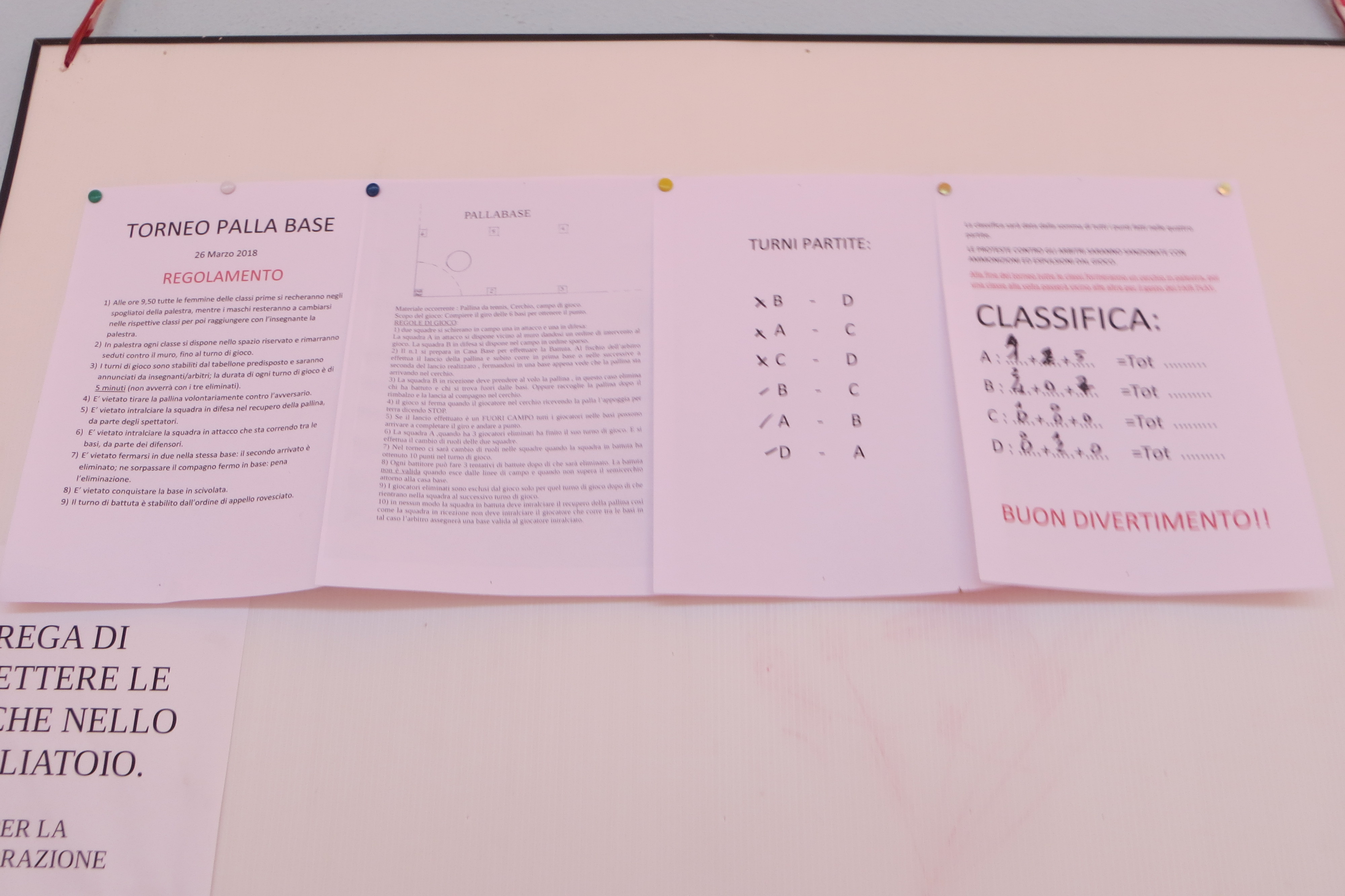 Il torneo si è svolto a conclusione del periodo di preparazione dei ragazzi al gioco. I giocatori della squadra battitrice si posizionano fuori dal campo. Ognuno di essi deve lanciare dalla base di battuta la palla all’interno del campo e, subito dopo, percorrere il perimetro del campo passando di base in base, mentre la squadra ricevitrice dovrà cercare di colpirlo fuori dalle basi. Se il giocatore battitore percorre tutte le basi senza fermarsi, ottiene 10 punti. Ad ogni sosta effettuata in ogni base viene sottratto un punto. Il giocatore colpito non riceverà alcun punto. Quando i giocatori della prima squadra terminano il giro, le squadre si scambiano i ruoli. Prossimamente, le alunne e gli alunni, impareranno un nuovo gioco, sempre nel segno del rispetto delle regole, divertendoci insieme.